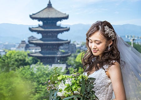 チャペルの窓一面に広がるのは東山の景色と青い空。「清き水」の音だけが軽やかに心地よく響きます。縁結びの神様として1300年以上もの間、信仰を集めてきた「地主神社」の神様に見守られて、とっておきの一言を。生涯忘れることができない一瞬を迎えませんか。