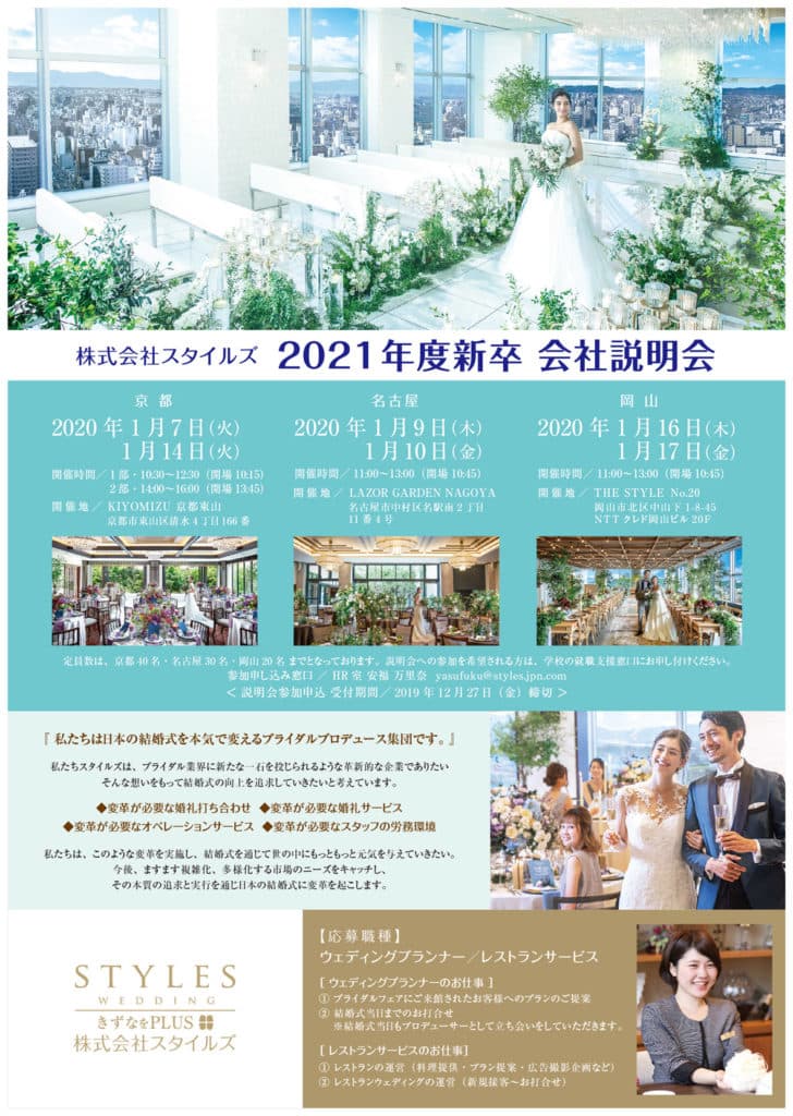 CLOVER NEWSニュース RECRUIT COMPANY 【2021年度新卒】最高の感動をお客様に提供するクリエイターに! 【2021年度新卒】最高の感動をお客様に提供するクリエイターに! 最高の品質とおもてなしをこだわりぬいた空間で作り上げるウェディング。今日よりもっと素敵な明日を思うあなたを本気で応援するスタイルズの一員として一緒に感動を提供しませんか。京都・岡山・名古屋における2021年新卒会社説明会のご予約受付を開始しました。 <問い合わせ先> 営業統括本部 HR人財開発担当 安福万里奈 <yasufuku@styles.jpn.com> 婚姻届の書き方は?押さえるべきポイントや注意点 NEWS TOP 『ウェルカムベビーの結婚式場』認定会場!スタイルズはパパママ婚・キッズ婚を応援します 関連記事 RECRUIT COMPANY 2024.11.14 【2026年度新卒 会社説明会】申し込み受付を開始しました! MORE RECRUIT COMPANY 2024.05.19 【2025年度新卒】株式会社スタイルズ 会社説明会のご案内 MORE RECRUIT COMPANY 2024.04.08 【STYLES Inc.】2024年度新入社員『入社オリエンテーション』が開催されました 2024年度10名の新入社員を迎え 『入社オリエンテーション』を実施いたしました 入社後 最初の3日間に受講する導入研修... MORE RECRUIT COMPANY 2023.12.20 【2025年度新卒】STYLES Inc.会社説明会開催いたしました! MORE NEWS COMPANY OKAYAMA YOKOHAMA MEDIA COMPANY OKAYAMA YOKOHAMA RECRUIT COMPANY OKAYAMA YOKOHAMA KNOWLEDGE