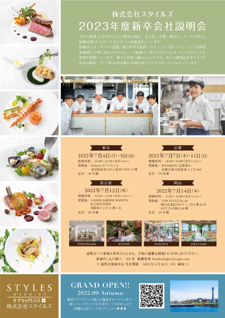 人生の特別な時間を彩るお料理。当社では、新郎新婦様とお打ち合わせを行い、1組様ずつ異なるフルオーダーメイドのコース料理を提供しています。今日よりもっと素敵な明日を思うあなたを本気で応援するスタイルズの一員として一緒に感動を提供しませんか。今回は調理スタッフを対象に説明会を開催します。