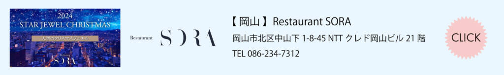 CLOVER NEWSニュース NEWS OKAYAMA YOKOHAMA 2024 全店レストランで<CHRISTMAS DINNER>開催! 今年もスタイルズのレストラン全店、岡山<レストラン ソラ>、京都<東山庭>、名古屋<ラソールガーデン・ダイニング><ザ・テラス 横浜マリンタワー>でクリスマスディナーを開催します。素敵な雰囲気と贅を尽くした料理でロマンティックな聖夜を満喫いただきます。詳しくは各店のサイトをご覧ください。 レストラン4店舗のHPをリニューアルしました! NEWS TOP 【2026年度新卒 会社説明会】申し込み受付を開始しました! 関連記事 NEWS OKAYAMA YOKOHAMA 2025.02.14 劇場版『トリリオンゲーム』ロケ地としてTHE STYLEが使用されました MORE NEWS OKAYAMA YOKOHAMA 2025.01.07 岡山 Restaurant SORA ランチ営業を再開いたします MORE NEWS OKAYAMA YOKOHAMA 2025.01.02 【STYLES Inc.】2025年 新年のご挨拶 MORE NEWS OKAYAMA YOKOHAMA 2024.12.30 【STYLES Inc.】2024年 年末のご挨拶 MORE NEWS COMPANY OKAYAMA YOKOHAMA MEDIA COMPANY OKAYAMA YOKOHAMA RECRUIT COMPANY OKAYAMA YOKOHAMA KNOWLEDGE