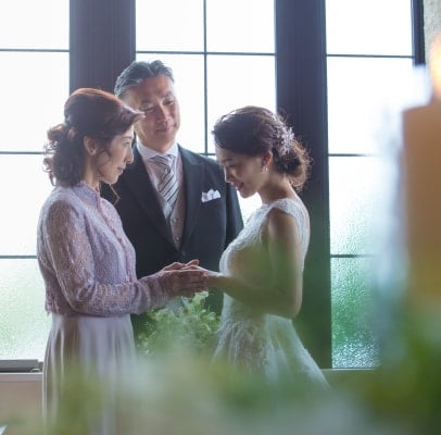 ゲストのお顔を見て誓いをたてる挙式スタイル。おふたりらしく、アットホームな雰囲気に。