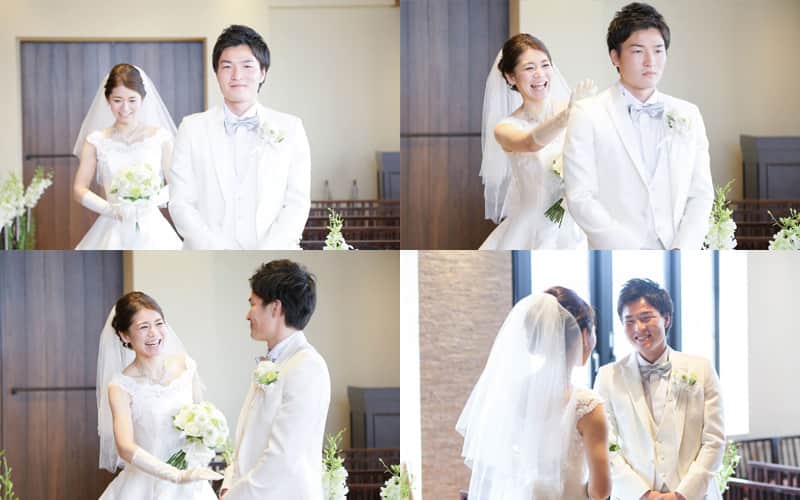 いたずらな笑顔で新郎様に近づく新婦様。緊張の面持ちで待ち構える新郎様。ウエディングドレス姿の新婦様を見てニヤニヤが止まらない新郎様。