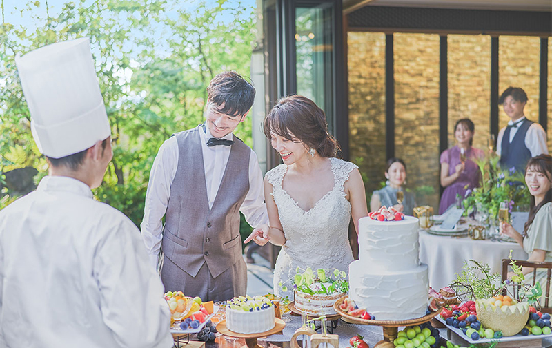 ガーデンでのデザートビュッフェやウエディングケーキ演出、撮影タイムなど、開放的に楽しみながら映える演出が叶うのもガーデンウエディングの魅力。