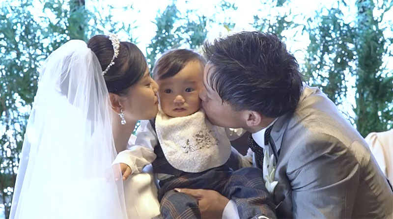 誓いのキスは、息子さんを真ん中に挟んで、息子さんのほっぺに新郎新婦それぞれがキスをするスタイル。