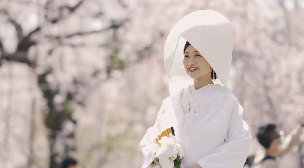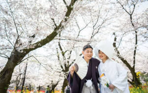 桜が満開の季節に行われたRYOTA & REAさんの神前式。