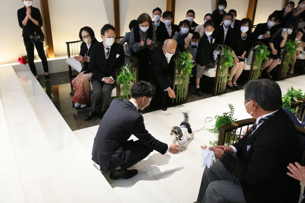 新婦の待つ場所へ新郎が向かう緊張感溢れるシーンも、新郎がペットを連れてバージンロードを歩いてくれば、フォトジェニックな心温まる瞬間に。