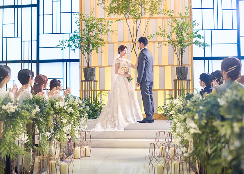 凛とした透明な空気感に、柔らかな光がとけこむ荘厳な空間。バージンロードを一歩ずつ進むほどに感動と感謝が高まり、花嫁の頬にあたたかな涙がこぼれます。