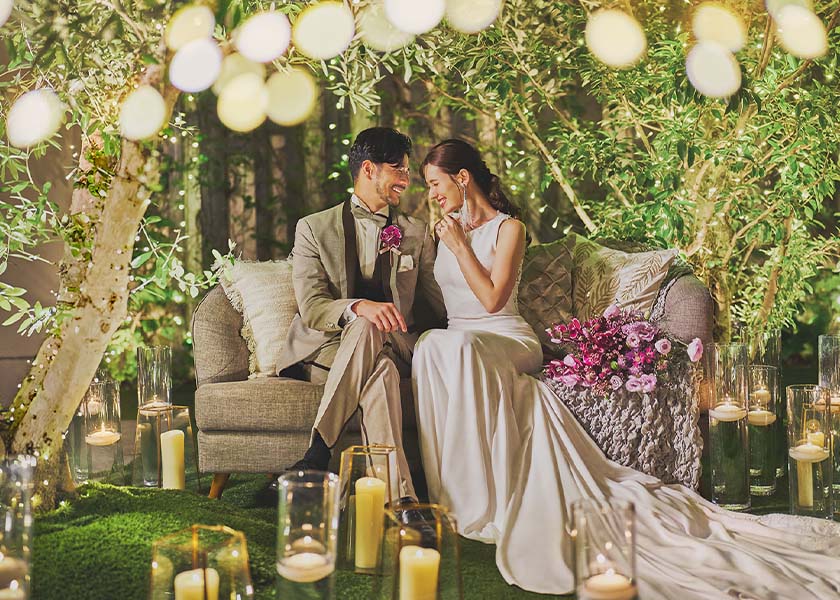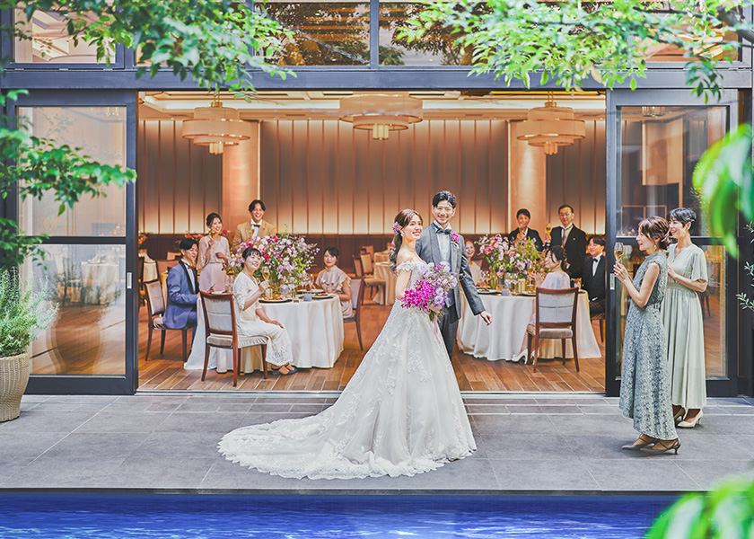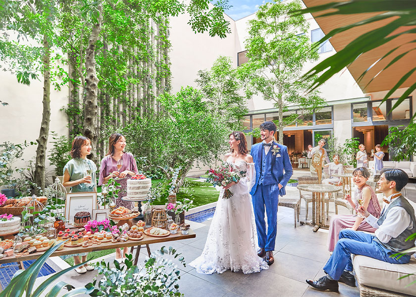 水と緑あふれるガーデンに陽光が降り注ぎ、一瞬ごとに表情を変えるフォトジェニックな空間。デザートビュッフェなど特別な演出でおふたりらしいおもてなしが叶います。