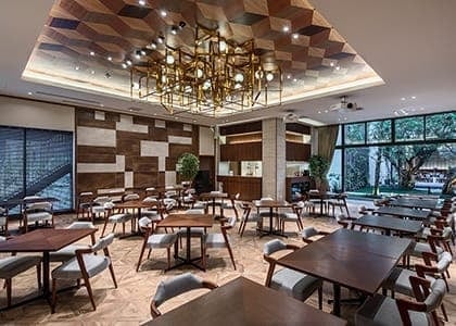 オーセンティックでモダンな空間美。洗練された落ち着きを宿すパーティ会場で、結婚式のテーマに合わせ、おふたりとゲストの皆様で心ゆくまでゆっくりお過ごしいただけます。