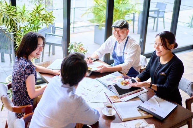 おふたりの想いをのせた一皿を創り上げるため、お話を伺い、それをどう表現するのかじっくり考えています。すべての料理人たちが丁寧に細部までこだわり、サービスが皆さまにそのカタチをお届けします。おいしく美しい一皿が想いを届け、笑顔を生みますように。