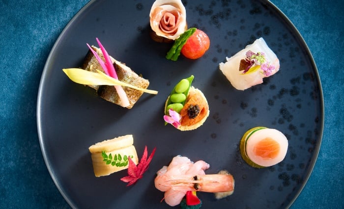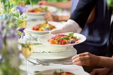 おふたりの想いを一皿に託して - おもてなしの要であるお料理。経験豊かなシェフたちが丁寧に手作りする逸品に妥協はありません。旬の食材がもつ鮮やかさやみずみずしさが息づく、見た目にもおいしい「世界に一つだけのメニュー」をご提供します。