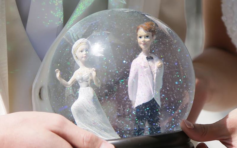 ガラスの中でふんわりと雪が舞い、きらきらとした小さな銀世界はとてもロマンチックでいつまででも見ていられそう。結婚式の飾り付けをそのままお部屋に・・・というのは難しくても、スノードームであればインテリアとして飾っておくこともできますし、ついついしまいこんでしまいがちな想い出のアイテムを、当時を想い出しながら手にとって楽しむことができるのがステキですね。