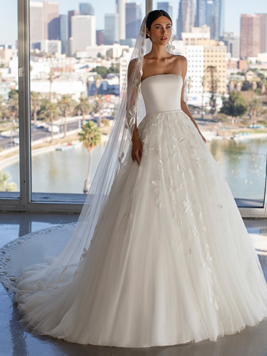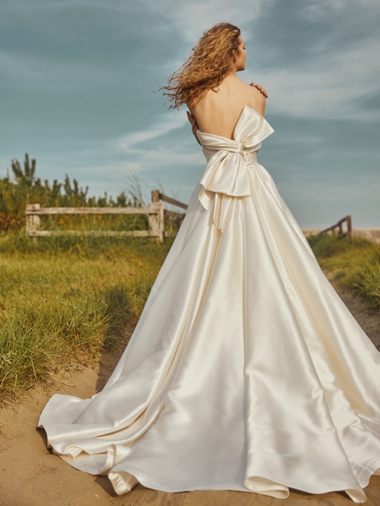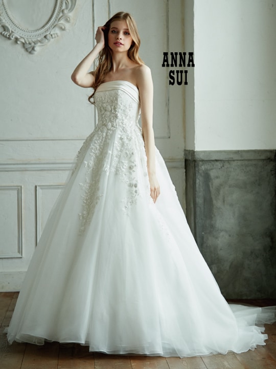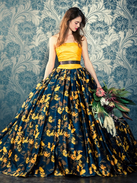 ひとめでわかる上質さとモード感を併せ持つ一着は、大人の花嫁をハンサムに輝かせます。折り重なる陰影が、吸い込まれるような艶に深みを加えて洗練された空気を醸します。
