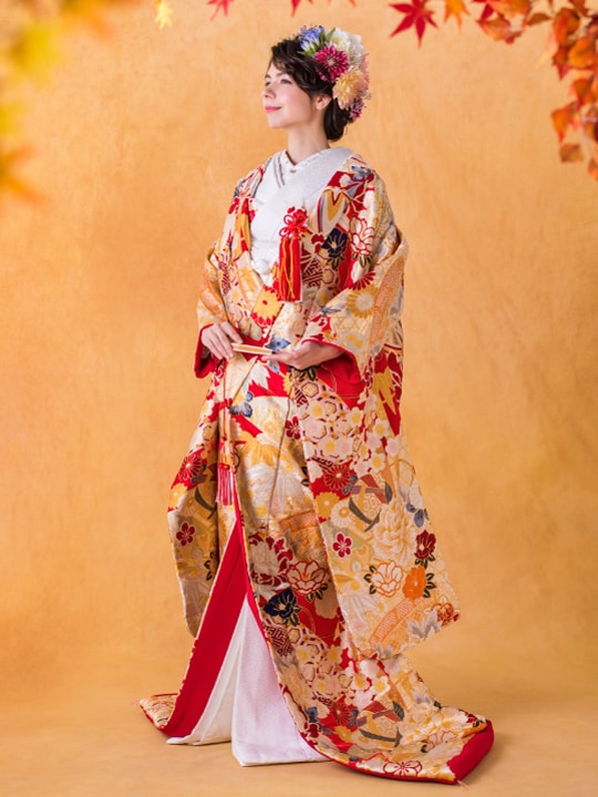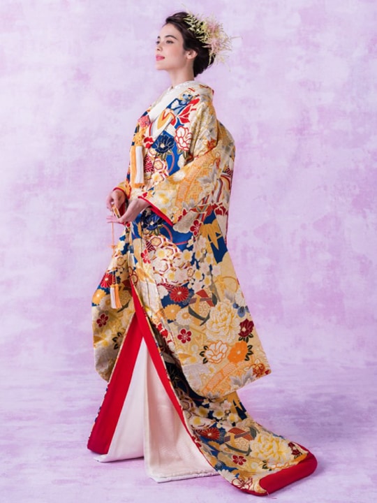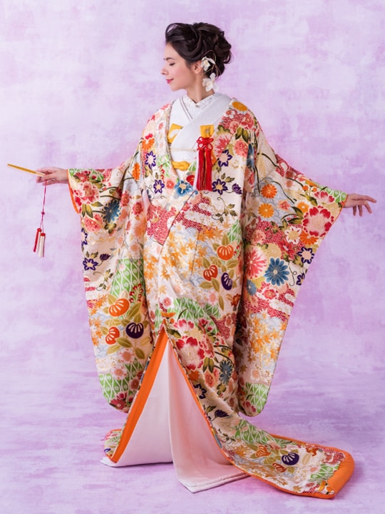 華やかな色打掛は、色あいも柄もさまざまに。しっとりとした織物には、職人の手により季節の花々や縁起物が描かれます。お顔映りや小物との組合せで自分らしい一着に。