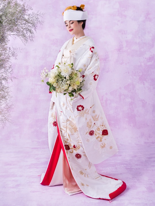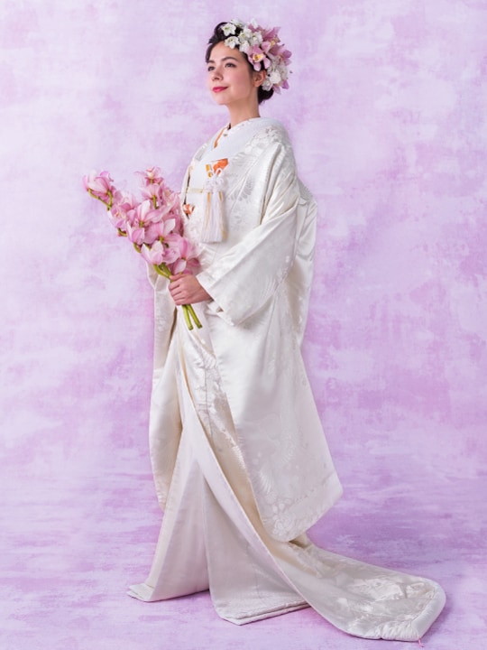 神聖で高貴な色とされる白で織り上げられた花嫁着物。「どんな家風にも染まります」という意味を持つと同時に、花嫁の凜とした美しさを際立たせる古式ゆかしいスタイルです。