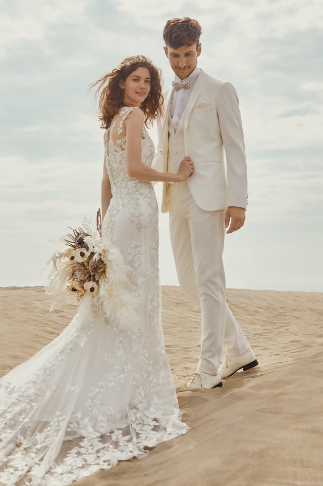 大人の男性としての余裕が伝わる、品格あるスタイル。折り目正しい純白のシャツや磨き抜かれた靴などアイテムにもこだわり、洗練された姿で花嫁をスマートにエスコート。