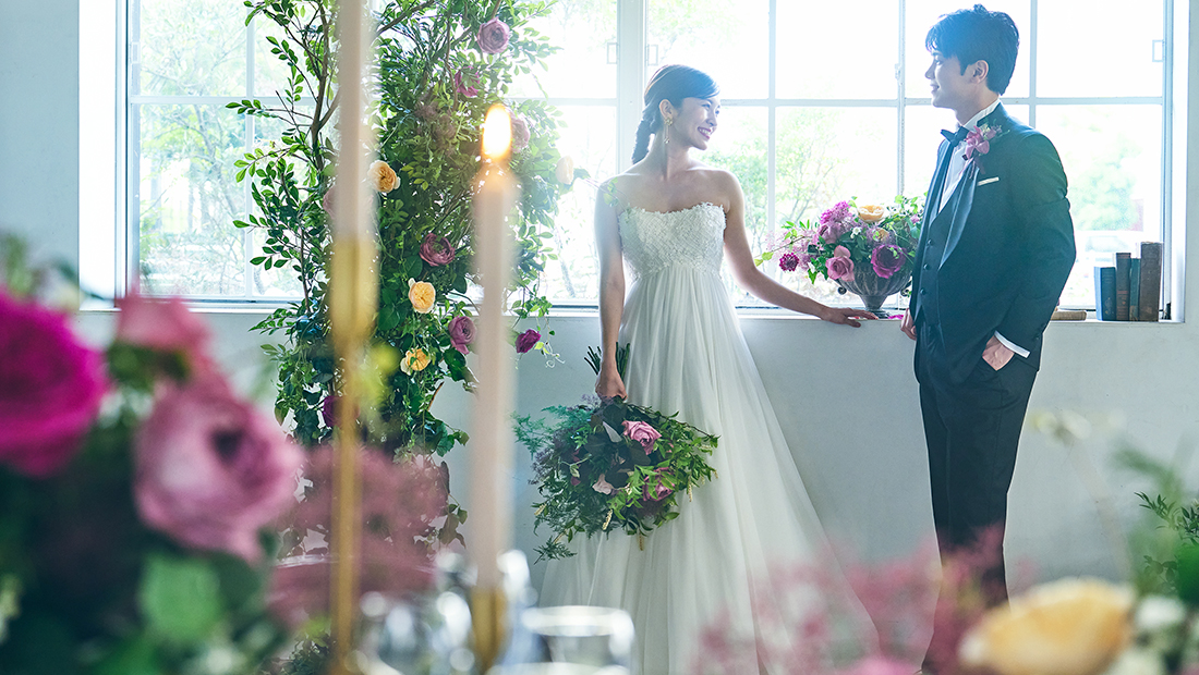 彼と一緒にウエディングドレス選びができれば、彼好みのドレスを選んだり、彼のスーツと合わせたコーディネートにしたりもできますね。