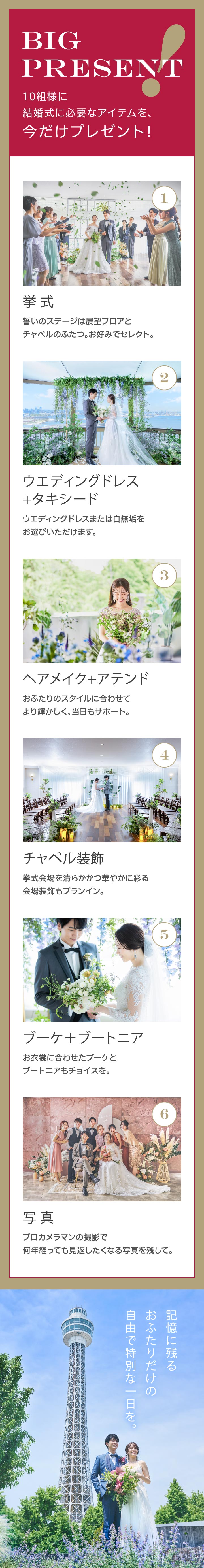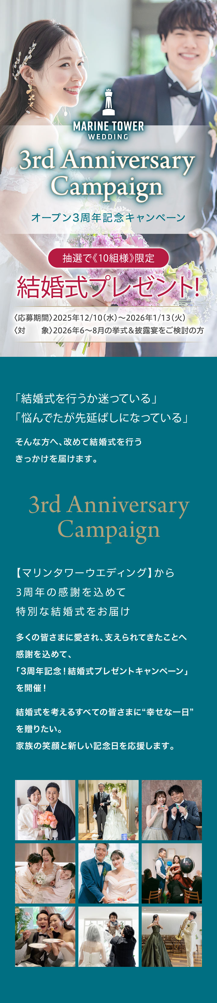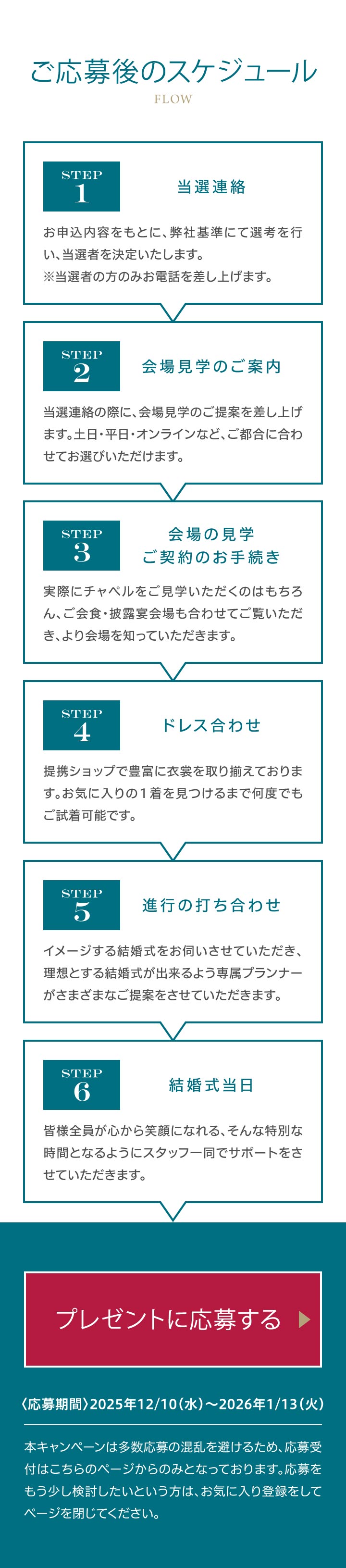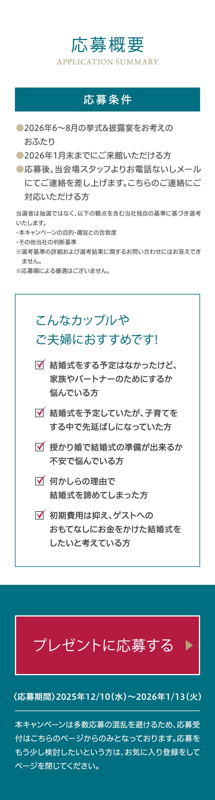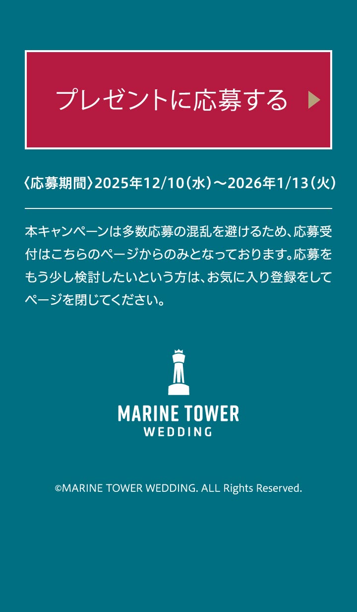 - 2026年6~8月の期間の中で、おふたりのご希望を伺いご予約可能なお⽇にちをご提案させていただきます。⽇程を重視されたい⽅はお早めに、本キャンペーンにご応募いただくことをおすすめいたします。