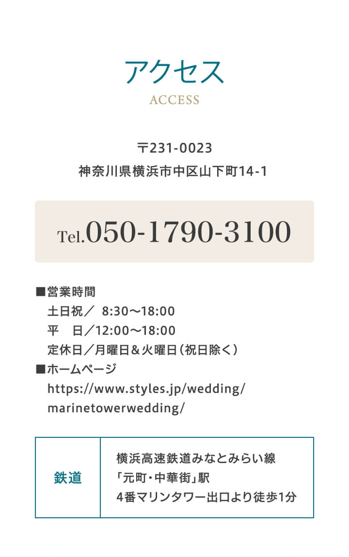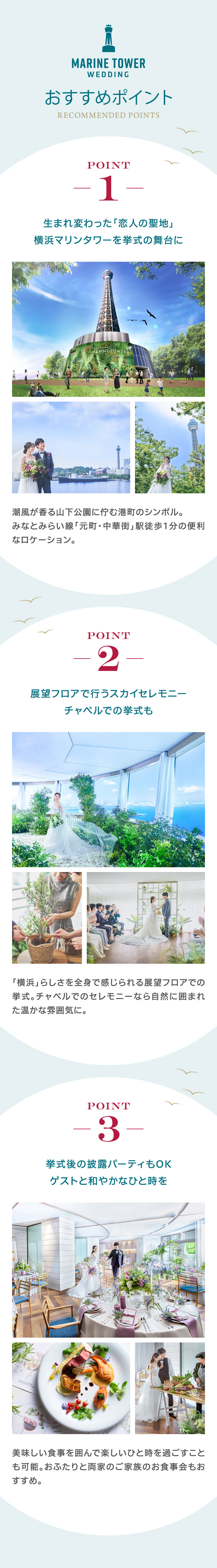 - ご家族やご友⼈様を招いて挙式を⾏っていただくことが可能です。マリンタワーの挙式会場は、最⼤80名様までご列席いただけます。お待合室などの付帯設備も充実しておりますので、お⼦様連れの⽅やご年配のゲストにも安⼼してご利⽤いただくことが出来ます。