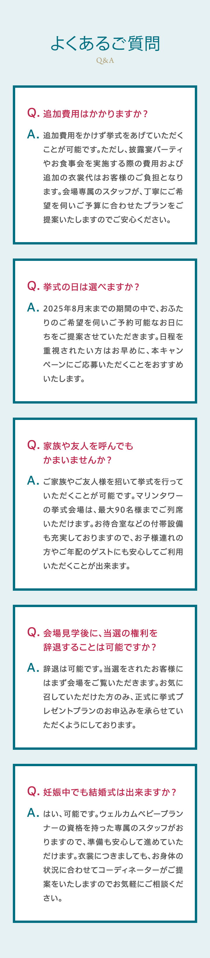 - 辞退は可能です。当選をされたお客様にはまず会場をご覧いただきます。お気に召していただけた⽅のみ、正式に結婚式プレゼントプランのお申込みを承らせていただくようにしております。