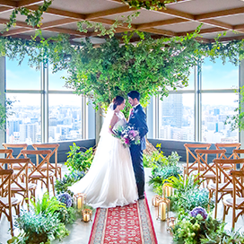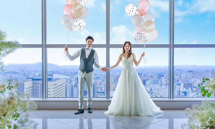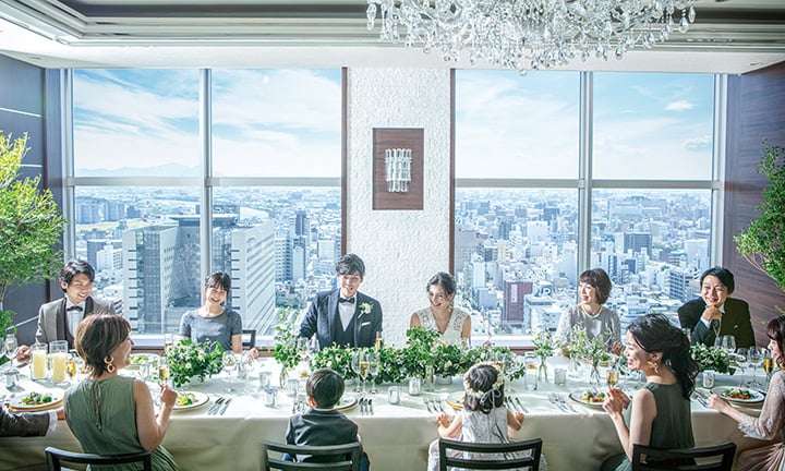 スカイウェディング「佳き日」という名の祝福のステージ。永遠の記念日となる当日は、窓いっぱいに広がる眺望さえも、おふたりとゲストだけのものです。光きらめくセレモニー、格別なお料理で、上質な時間が流れます。