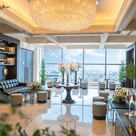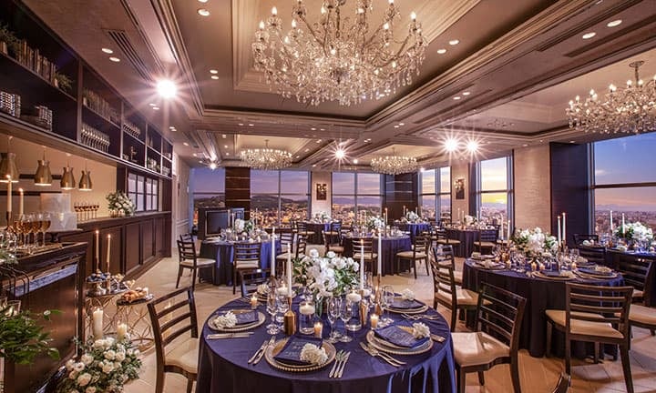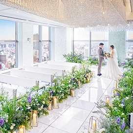 ラグジュアリー感が香る21階がおふたりのご希望を叶えるウェディングステージ。光がきらめき、窓の向こうにはパノラマ風景が広がります。