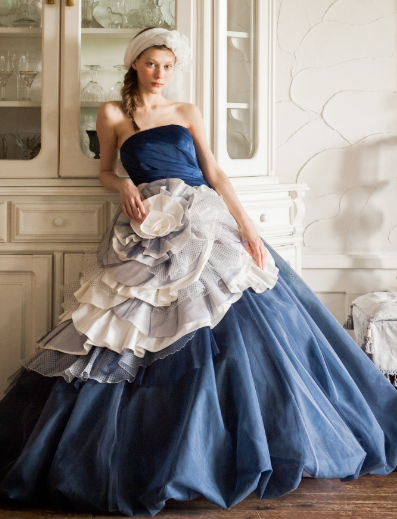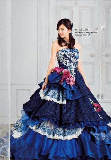 それに、ウェディングドレスの白から、紺へお色直しをすると、